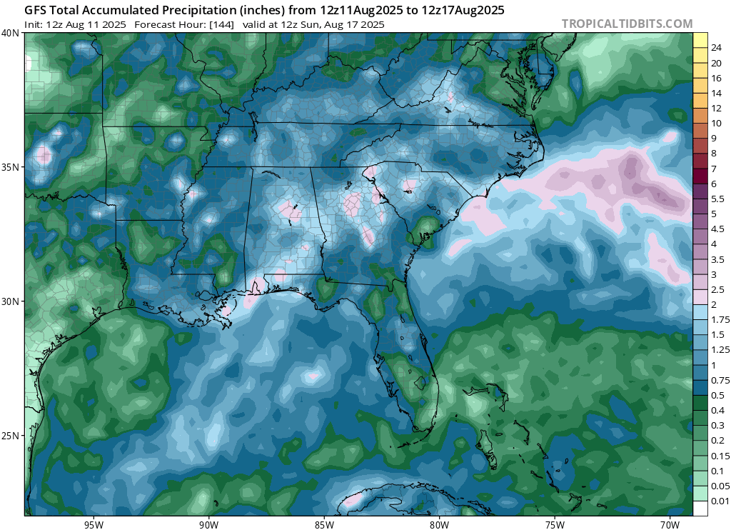 Due to the cold front passing through on Thursday and Friday, some above normal rainfall is expected for southern Appalacia for the week as a whole. After seeing a surpluss of rainfall this past weekend in Florida, much below normal rainfall is expected this week.
