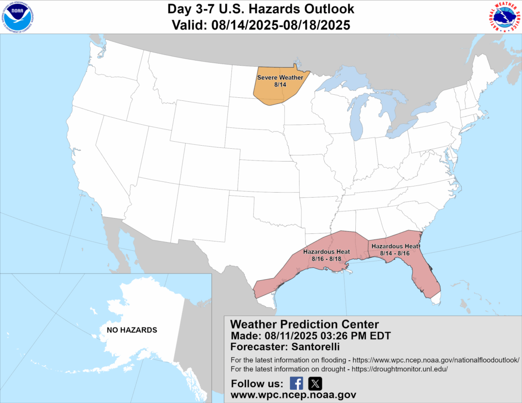 Above is a look at the U.S Hazards Outlook from NOAA, highlighting areas of extreme weather to be aware of for the next 3-7 days. A 15 percent chance of severe weather is highlighted for the northern Plains for Thursday 8/14. Hazardous heat conditions are expected in the coastal southeast from 8/14 through 8/18.