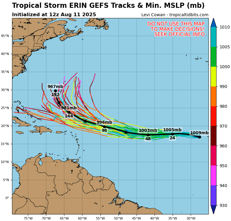 Tropical Storm Erin is moving west at 20 mph with winds near 45 mph and is expected to become a hurricane by midweek, possibly reaching major hurricane strength this weekend. Most models show it curving north later this week as the Bermuda High weakens and a cold front moves into the western Atlantic, steering it away from land. If that turn happens later than expected, the risk to the East Coast would increase, so it’s worth preparing now just in case.