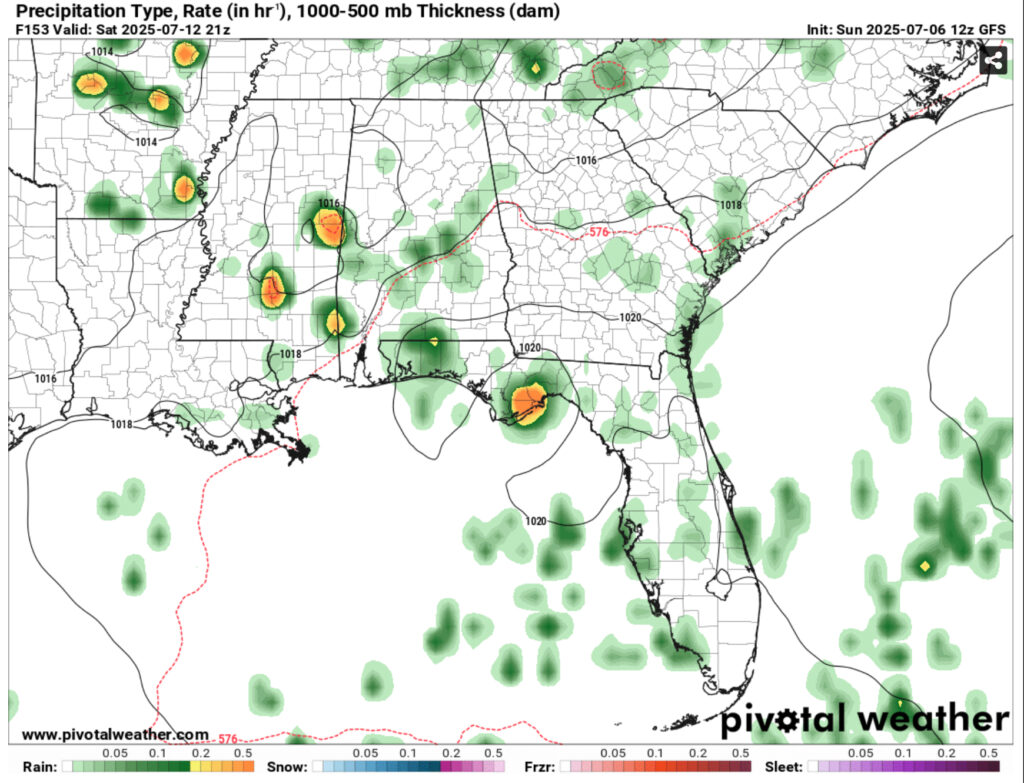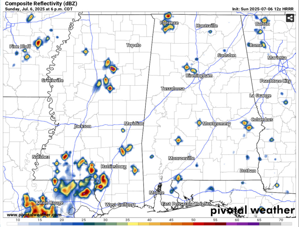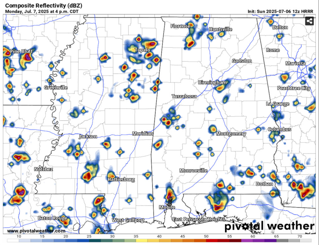 More rain is expected this afternoon as more Gulf moisture will allow pop-up thunderstorms to develop. While it’s been hot today, we’ll get a period of showers and thunderstorms across the Pine Belt and South MS/LA/AL. Mid-level flow shows storms forming and moving westward as the evening progresses before they fizzle out. Afterwards, we’ll have a brief cooldown with some humid conditions before sunset. Overnight lows will fall into the low 70s.