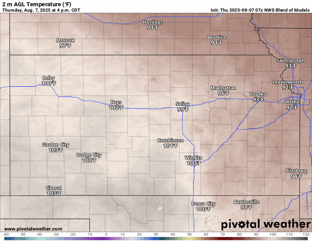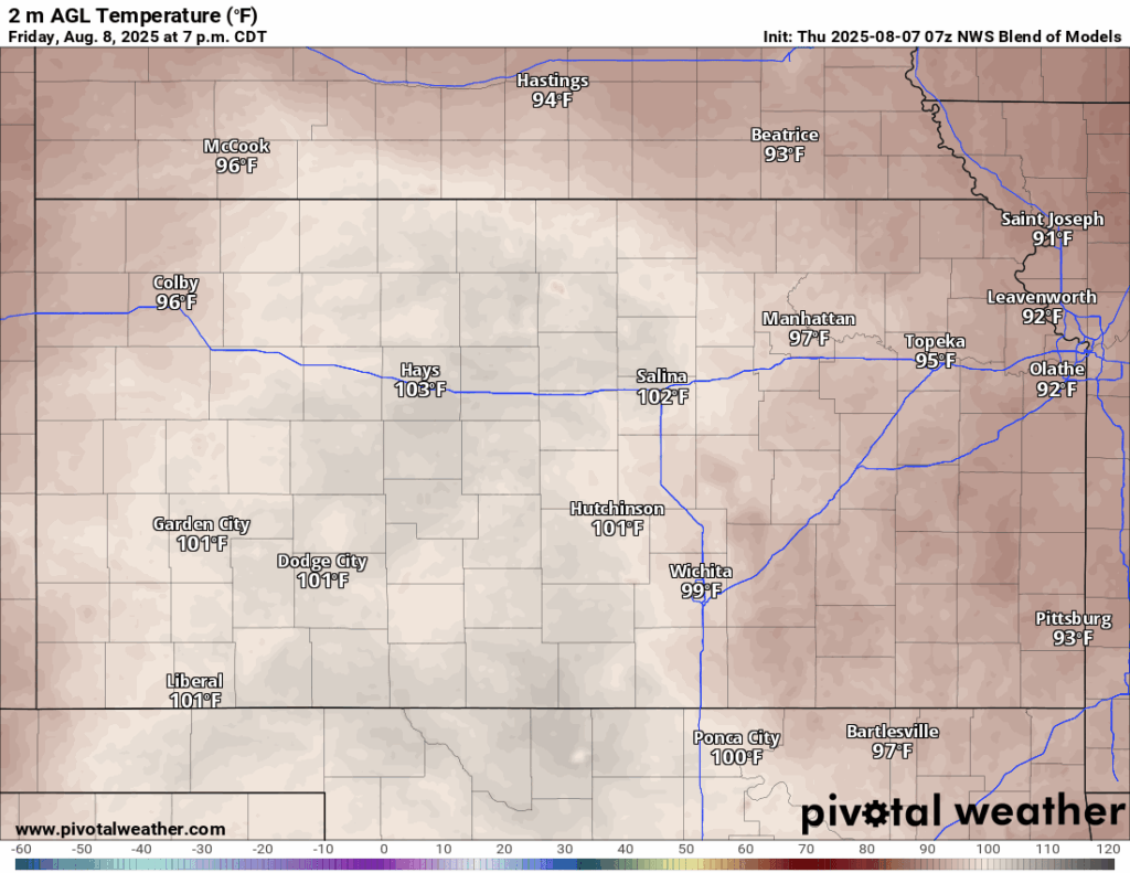 For tomorrow, wash, rinse, and repeat of today. Hot and dry conditions will continue, with high temperatures in the mid 90s to low 100s, with southerly winds of 10 to 20 mph gusting to 30. Heat indices will again reach the low to mid 100s, which has prompted continued Heat Advisories for central and southeast Kansas from 1pm to 8pm tomorrow. Temperatures overnight Friday/Saturday will be slightly cooler, making it down into the mid to upper 70s.