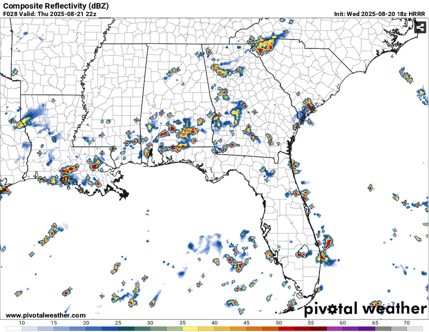 There’s a chance for scattered thunderstorms across much of the Pine Belt and much of South Louisiana and Alabama. These will hang around starting in the early afternoon to the late evening. By Friday, the front should move south and so will the storms. Expect more on the Highway 98 corridor and southward, though a few could move a bit north. Expect hot and humid conditions again with highs in the low 90s and the experienced temperature just around 100.