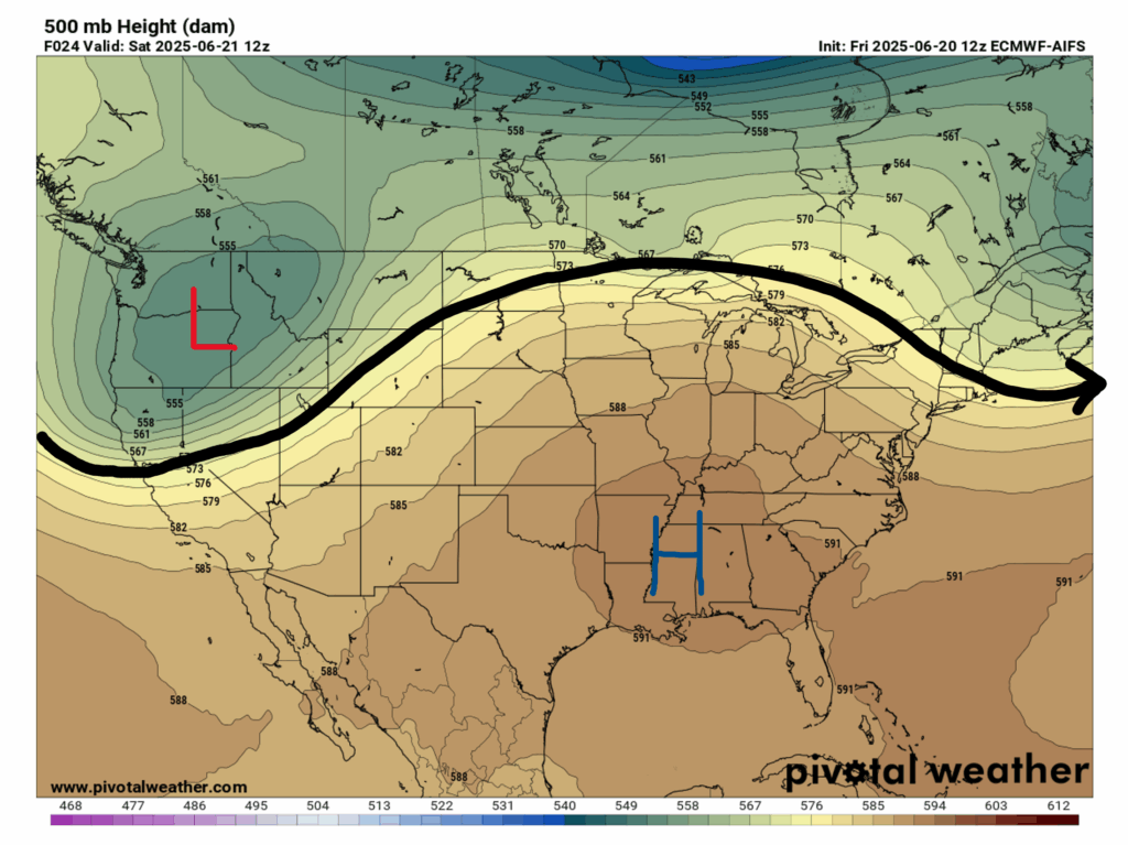Looking at our 500 mb map for today, we can see a trough and low pressure area over the Pacific Northwest, and a large ridge with an associated high pressure area right over us. The pro of this setup is that it will relieve us from some of the stubborn wet weather we’ve been experiencing, but the con is that we will experience some excessive heat in our area, especially this weekend and going into next week.
