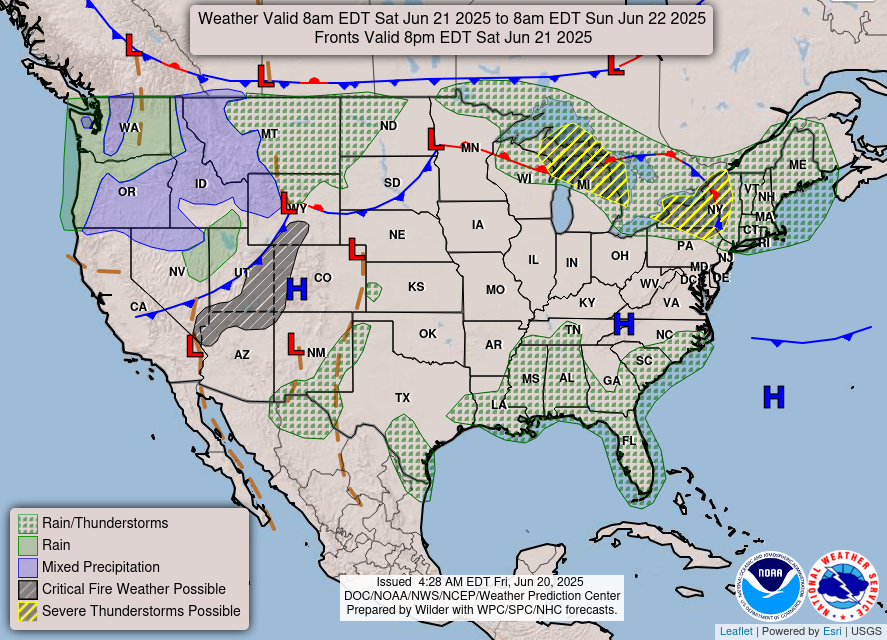 Friday: Mostly sunny skies in the morning with a slight chance of showers and thunderstorms in the afternoon. Highs in the low 90s during the day and lows in the mid 70s at night. Chance of precipitation 20%.