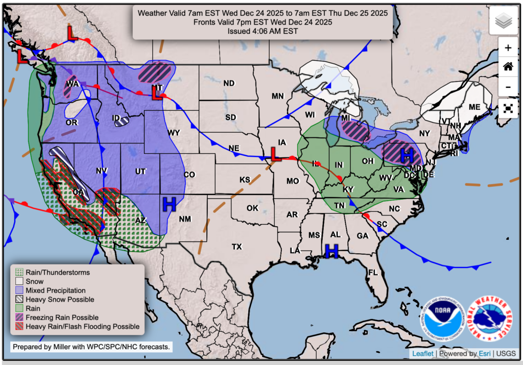 Merry Christmas Eve Eve! I chose to zoom out on the surface map above for tomorrow to show how much weather will be impacting travel on this busy travel day for much of the West, the Midwest, parts of the mid-Atlantic, and New England. It’ll be quite the hassle for them. For us, though, nothing in the way of the weather will get in your way for tomorrow if you’ll be on the roads, assuming you are staying in our region of the US. A nice high pressure will keep skies clear, but also rather warm for our Christmas Eve.
