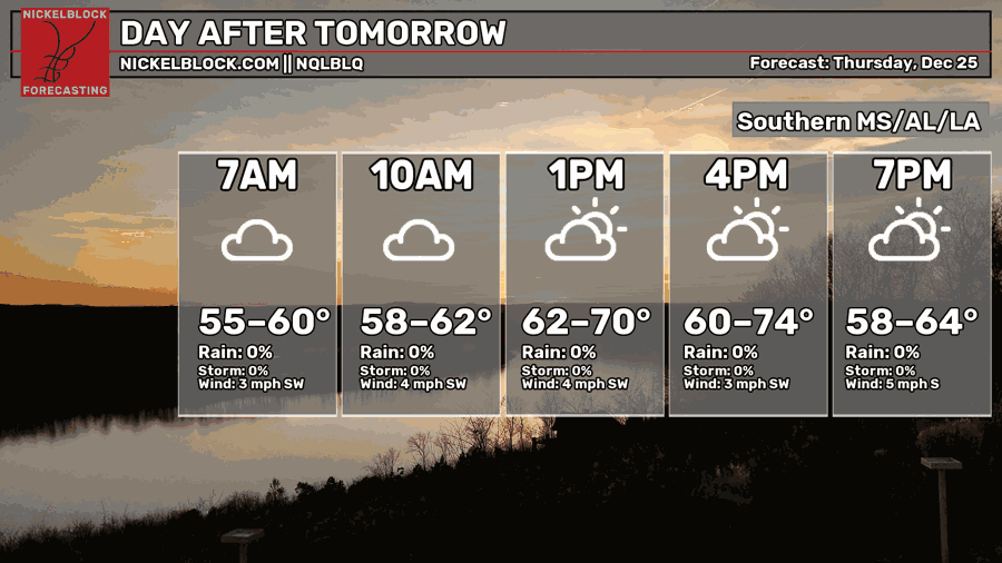 After we get through the fog, we’ll be left with some mostly cloudy skies, but the sun will come out shortly after, and we’ll have a mix of sun and clouds throughout the day. There’s no chance of any precipitation, and highs will sit in the mid-70s – a little too mild for Christmas if you ask me! Low’s tomorrow night when Santa flies his way into the NickelBlock region will be in the low-to-mid 50s.