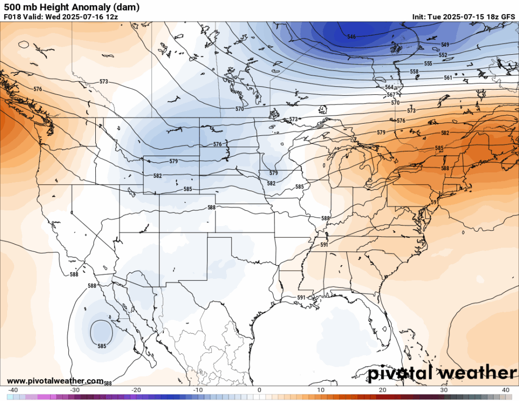 500 mb Height Anomalies for Today 7/16/25 // Courtesy: Pivotal Weather