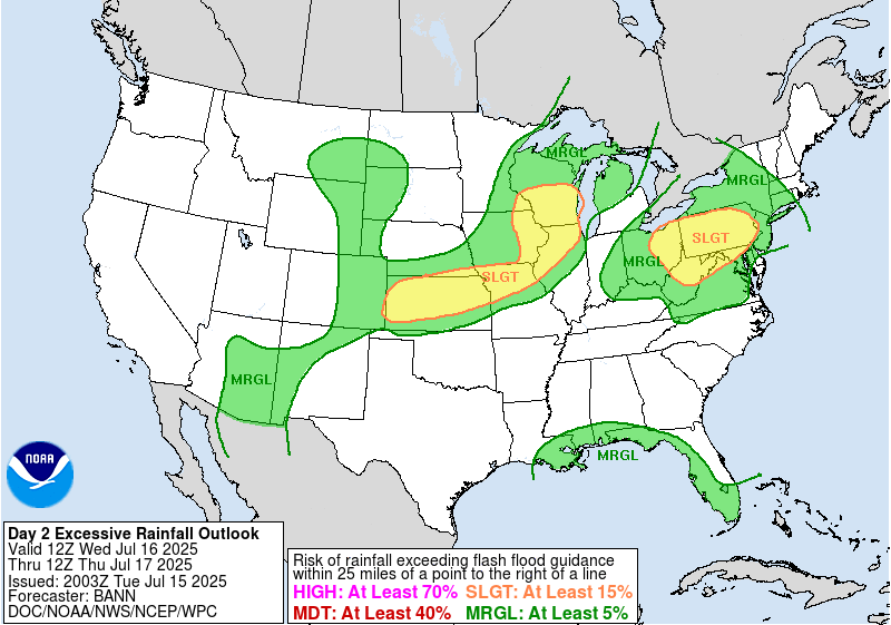 WPC Excessive Rainfall Outlook for Today 7/16/25 // Courtesy: wpc.ncep.noaa.gov