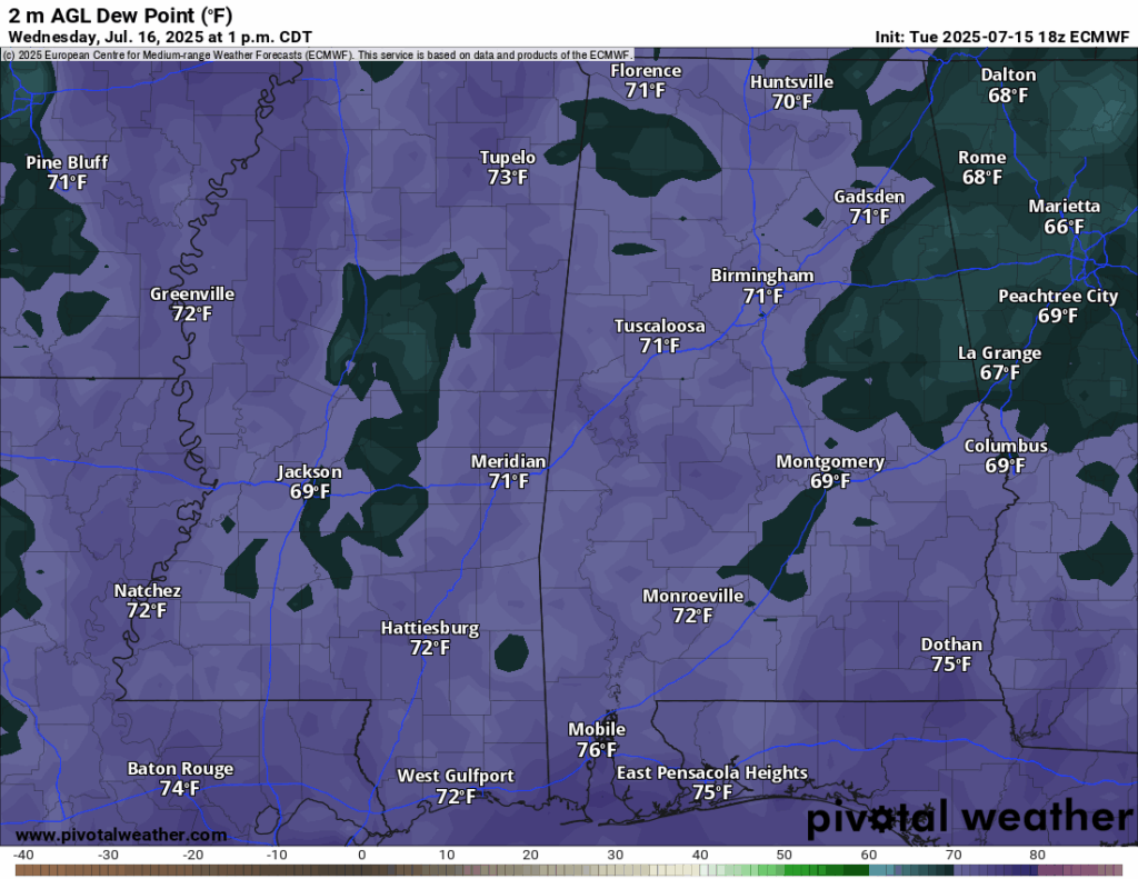 Dew Points at 1 pm Today 7/16/25 // Courtesy: Pivotal Weather