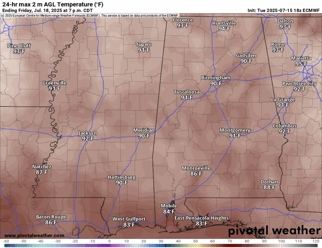 High Temperatures for Thursday 7/17/25 // Courtesy: Pivotal Weather