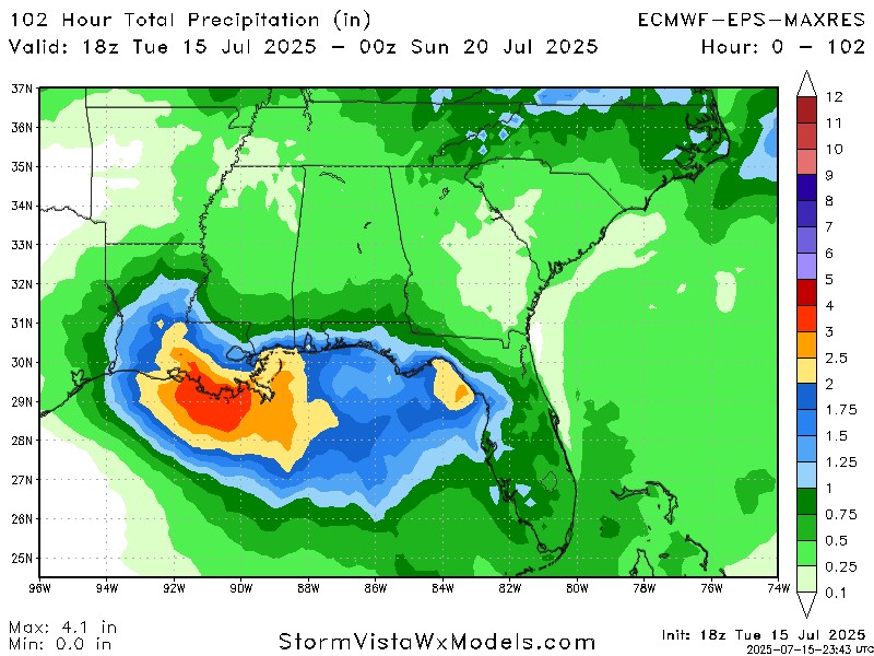 As the potential tropical system moves into our area, it will dump a lot of rain in its path. Thursday, Friday, and Saturday are all days that we will see rain from the system moving in. As of the current Euro ensemble model guidance, anywhere up to 5 inches of rain are possible in southern Louisiana, with locally higher amounts possible. The exact placement of the rain bands, which depends on the exact track of the low pressure, is still uncertain. In general, the biggest risk from this system will be the large amount of rain and rough surf. A flood watch is in effect for southeastern LA and coastal MS.