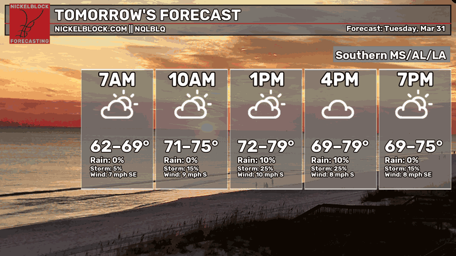 We can expect a mix of clouds and sun today with incoming low and mid-level clouds pulling from the south. So far, the rain chances are concentrated towards much of southeastern Louisiana, but we may see a few cells make their way up towards southwestern Mississippi and even parts of the Pine Belt. Highs will be in the low 80s, so it’ll feel warmer than it did yesterday. Overnight, we’ll reach the low 60s.