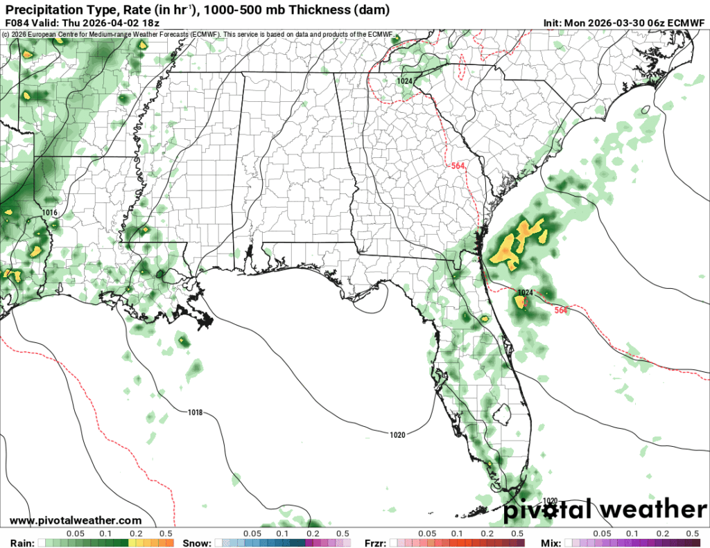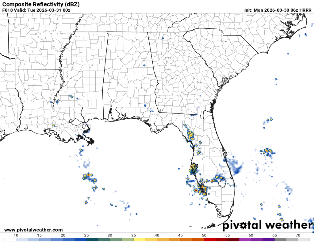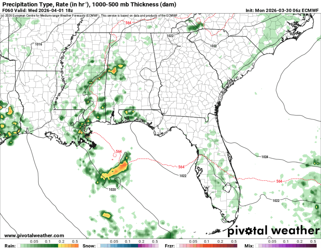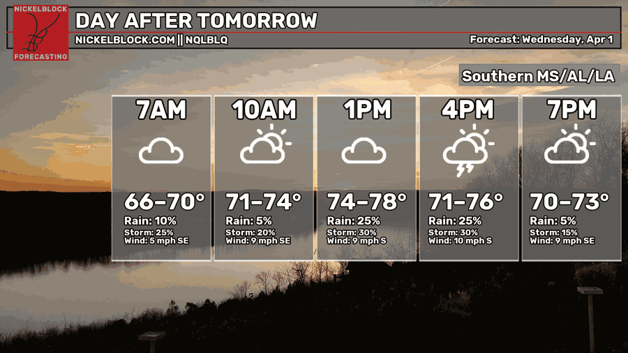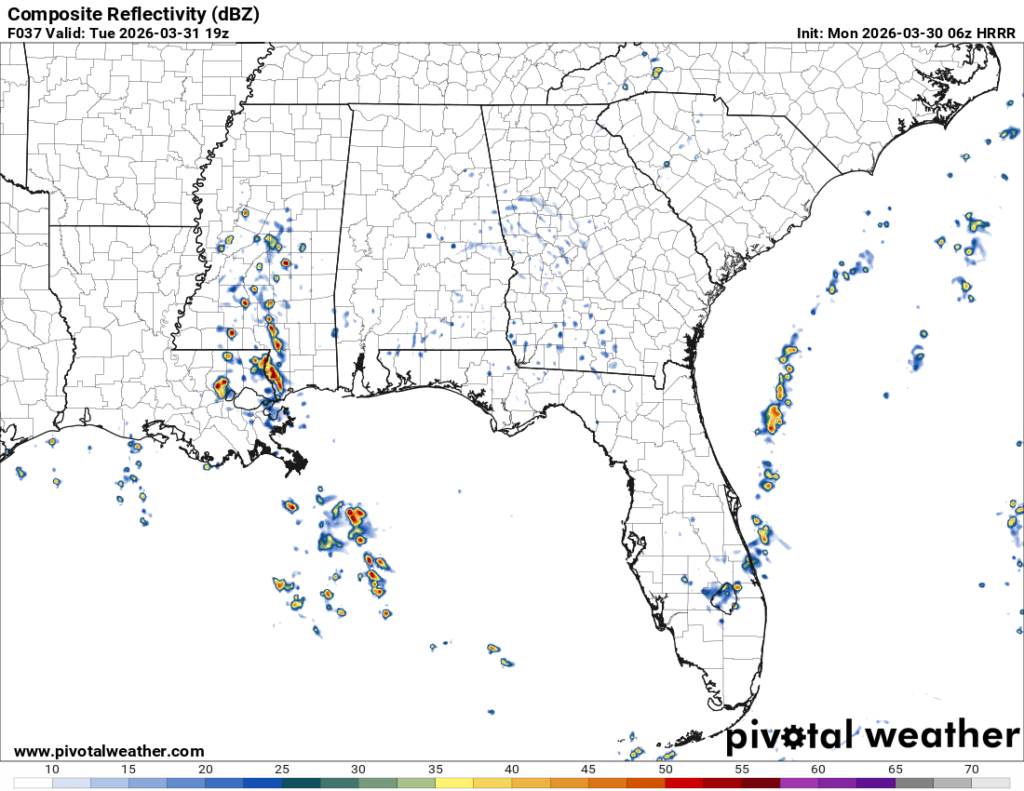 Another round of showers and thunderstorms are possible Wednesday afternoon. This is based on more gulf moisture and CAPE, so cells won’t develop everywhere, but will be scattered across the Gulf south again. Otherwise, expect a mix of clouds and sun during the day with highs in the mid to upper 70s and a low in the mid 60s.