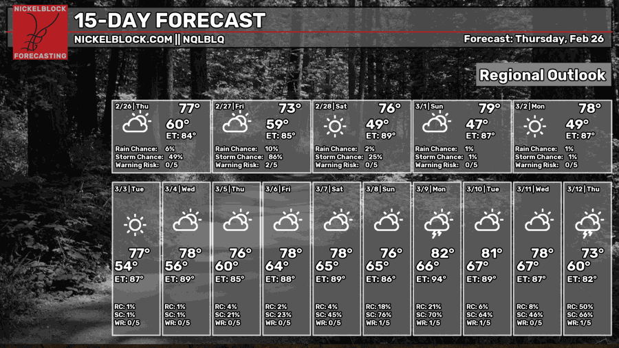 Look at all of that red! It’s shaping up to be a very warm start to March for most of the country, and also a wetter one too! A more active storm track is setting up for the central and eastern portions of the US, which could mean an early start to the severe season?? As for us, more specifically, we’re going to keep the trend of highs in the 70s and near 80 for a little while, and check out the rain chances for the end of the 15-day forecast… we could see an increased amount of rain given the active storm track.