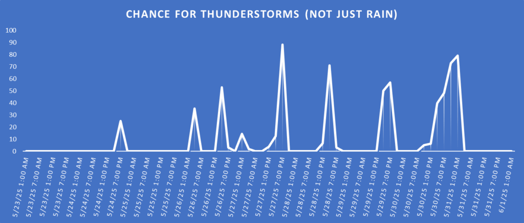 Looking at some of the AI-assisted guidance for the chance for storms (not just when it will be raining, but when there may be storms) it looks like we have a good number of chances during the next 10 days.