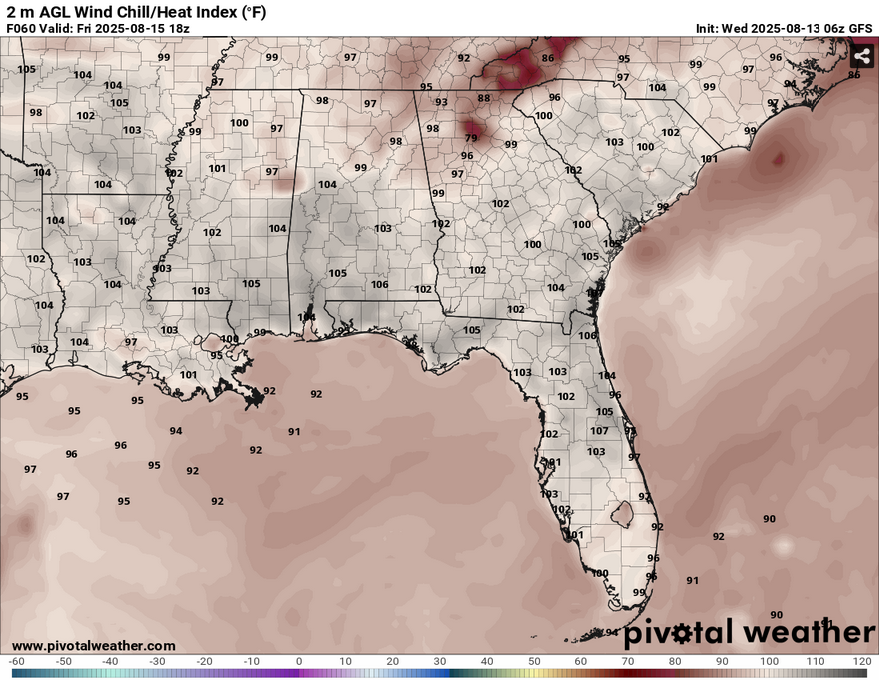 Heat index (experienced temperature) for Friday afternoon from the GFS model //Courtesy: Pivotal Weather