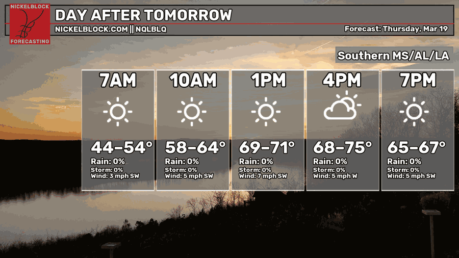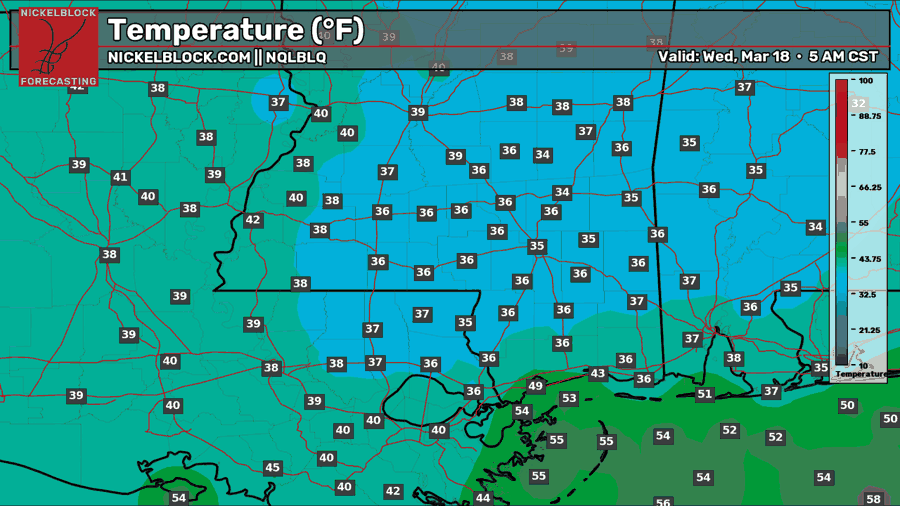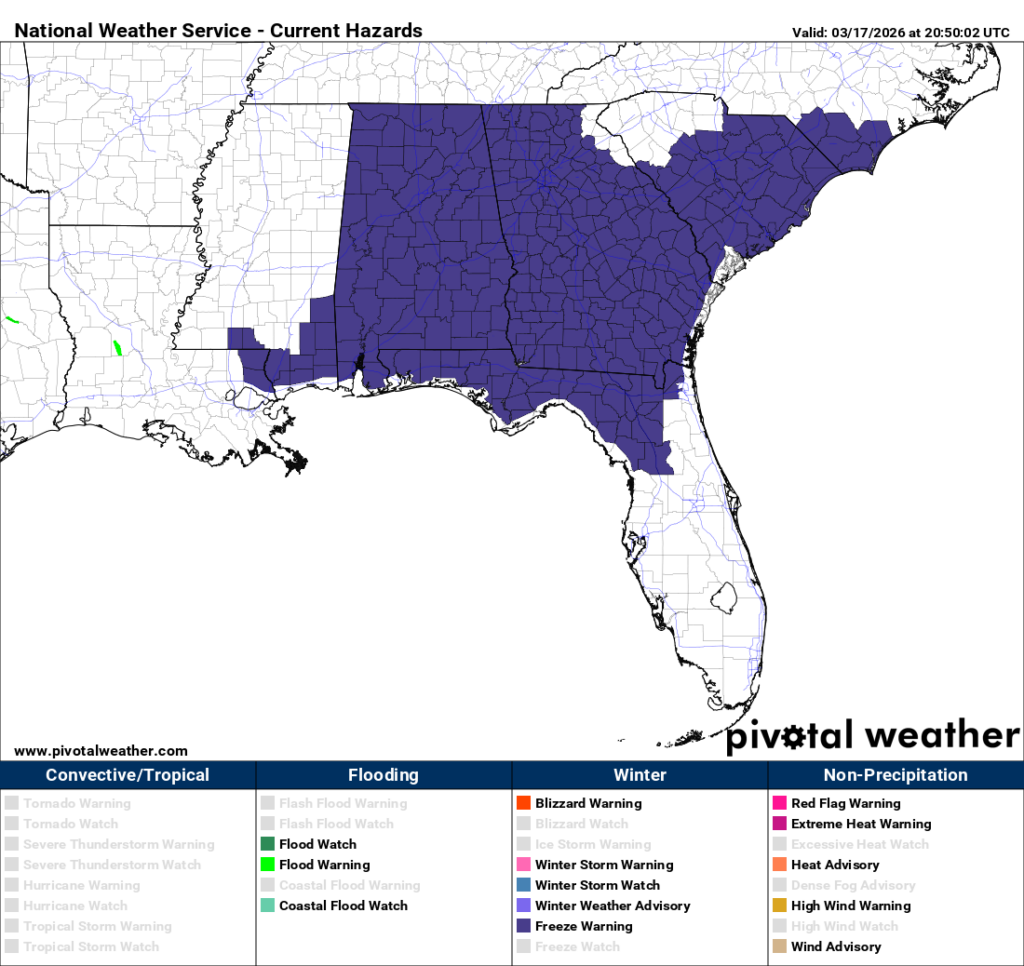 Tonight, we will likely see our last freeze of the season, given that we are under a northerly chilly flow, temperatures will drop to or below freezing, and winds will calm during the late night and early morning hours tomorrow. Our NQLBOT temperatures above might be a little higher than what we’ll actually see, so plan for a spotty freeze in southeastern Mississippi and Alabama with temps at or just below freezing. Ensure any outdoor plants are brought inside just in case. Freeze warnings are in effect for the counties below, which should be the most prepared for a freeze.