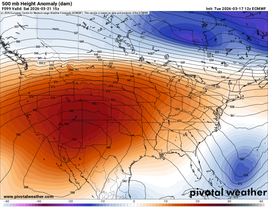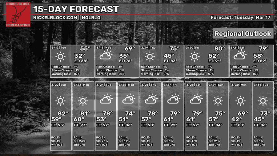 After what has seemed like week after week of severe weather threats, we are finally looking at a more stable atmosphere for a little while. High pressure will be settling in and making itself comfortable, thanks to a pretty large ridging pattern that will also be moving in. In the image above, you can see that there is no rain in the current forecast for much of the southeast and central US, including our region. Plus, some warmer-than-average temperatures are on the way, no shocker there! Astronomical spring is only 3 days away, and it will surely feel like it after tonight.