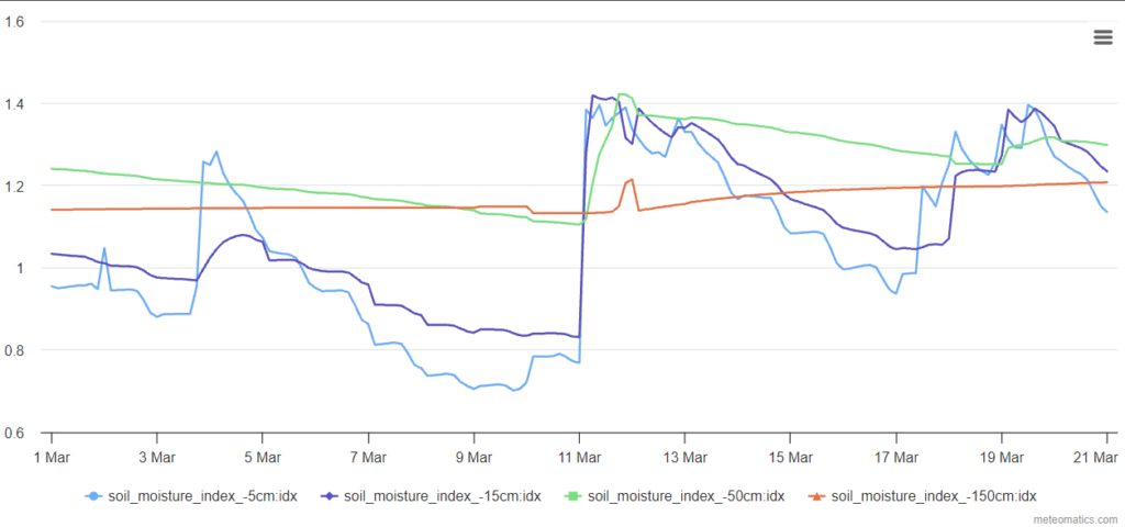 Meteomatics data for soil moisture indicates the wetness of the soil. This index is computed using the permanent wilting point (0, no available moisture at all) and the field capacity (1, overflowing with moisture), which both depend on the geographical location (soil type). Note that the index can exceed 1 during and after rainfall events. The soil moisture index is available for 4 depth levels.