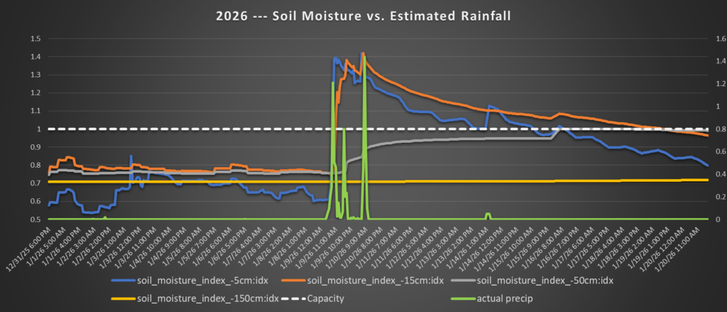 Looking at the same comparison between rainfall and soil moisture, we can see how quickly the soil rainfall pushed all depths being measured to “above field capacity” levels.