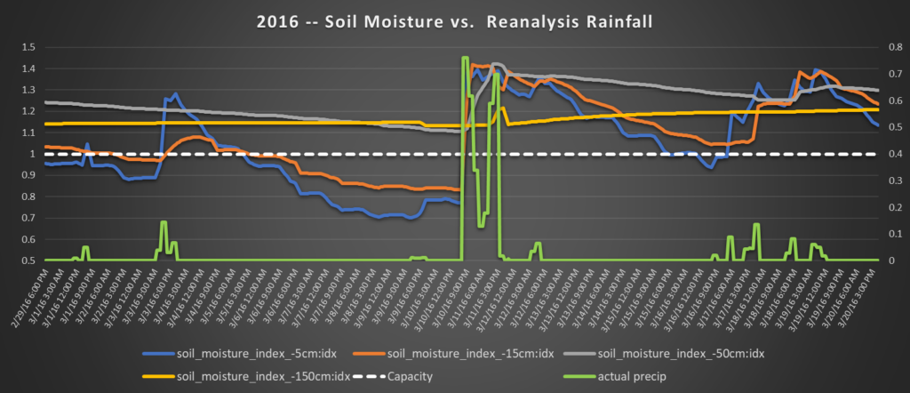 In fact, when you overlap the estimated precipitation on top of the soil moisture, you can see exactly how quickly the rain translates to run-off