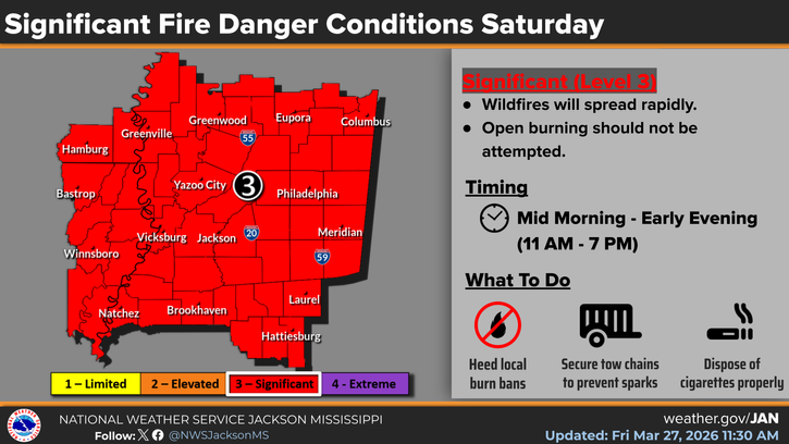 Low Humidity and Gusty Winds Bring Fire Danger for Saturday: Southern MS/AL/LA Local Weather Forecast – 3/27/26