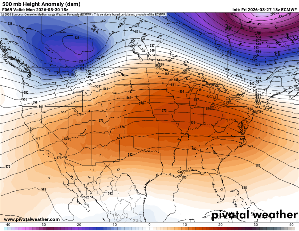 Monday’s 500 mb Height Anomaly Map // Courtesy: Pivotal Weather
