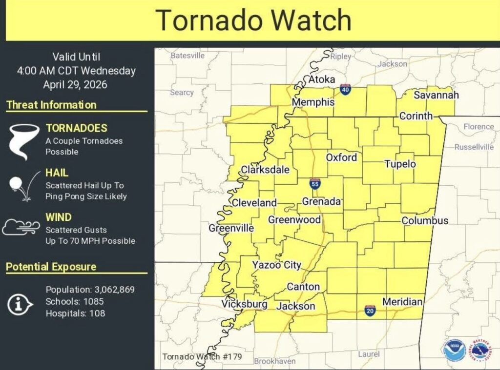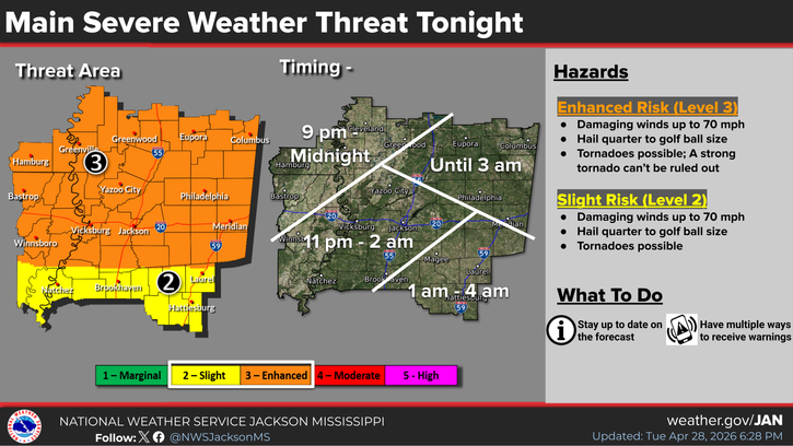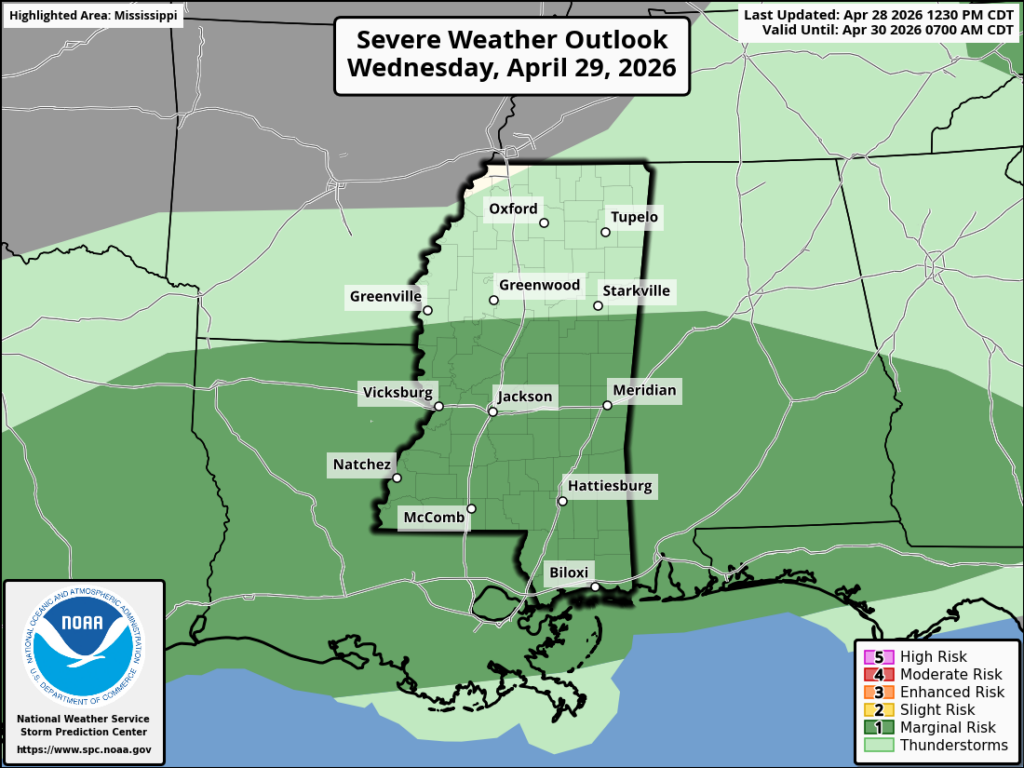 It’s been a busy day and night so far for those to our north, but we are still expecting a few batches of heavy rain and thunderstorms to move southward into our region through tonight and tomorrow. There’s an Enhanced Risk for those a little farther north, and a Slight Risk of severe weather tonight, with the potential for very large hail, damaging winds, and an isolated tornado or two. The NWS graphic above shows the approximate timing of the severe weather threat coming through the area, highlighting only Mississippi. For everyone else, expect later on the further south you are. This is only a scattered event tonight, but any storms that do get into our area could become severe.