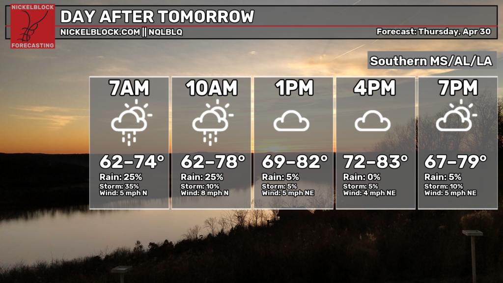 A mix of sun and clouds tomorrow will build up the instability in the atmosphere and will allow for some strong-to-severe thunderstorms to move in over our area. It looks like the main threat will be more centered on our region, southern MS/AL/LA, instead of farther north, but the overall threat is lower, as of tonight. We’re under a Level 1 (Marginal) risk for large hail, gusty winds, and the chance of a tornado. The HRRR shows some cells in the early afternoon, followed by a cluster of nasty storms later in the afternoon through the evening, likely with a wind threat, with some leftover rain through the night into Thursday morning. Expect a high in the upper 80s, near 90, with some very sticky humidity.
