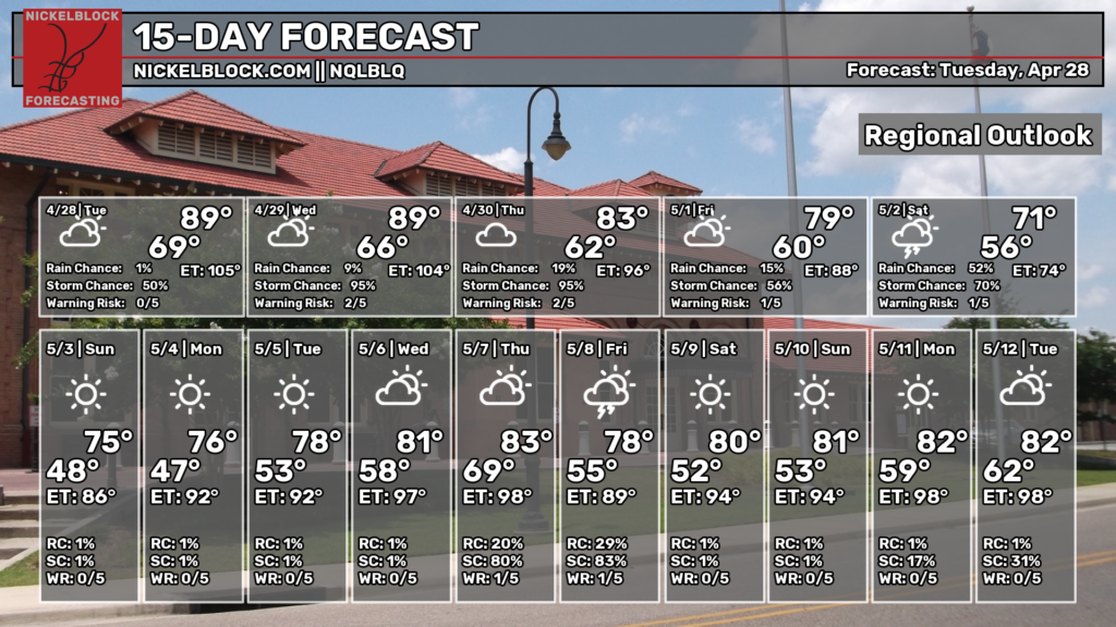 Tonight, we’ll see low temperatures in the upper 60s, with some thunderstorms coming through overnight. Ensure you have your notifications turned on for emergency alerts, just in case your area is under an NWS-issued severe thunderstorm or tornado warning! Overall, I do think the bulk of the worst will stay north, say north of I-20, but a few sneaky cells could make it south into our area, so it’s worth keeping an eye on and ensuring we are aware that the threat exists.