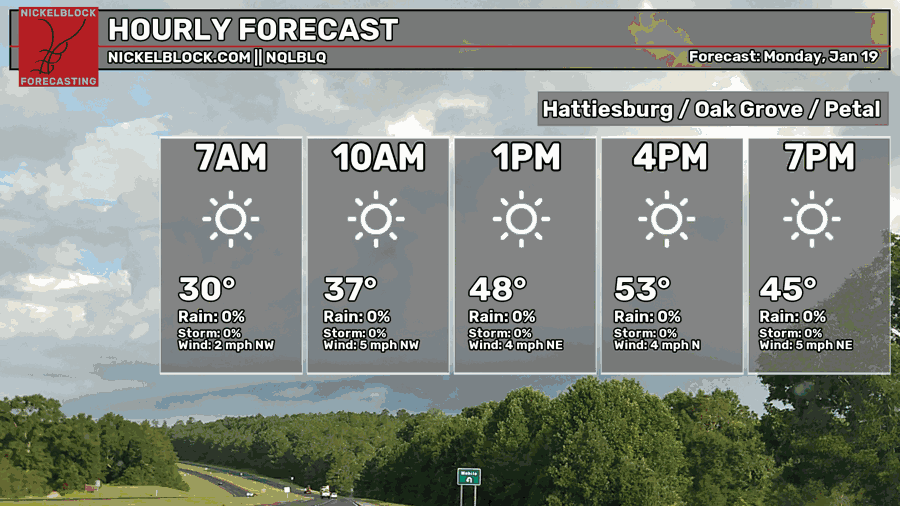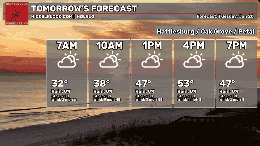 Upper level clouds will cover the skies across much of the Pine Belt and further south. Expect another cool day with a high in the low 50s and a low in the mid 30s.