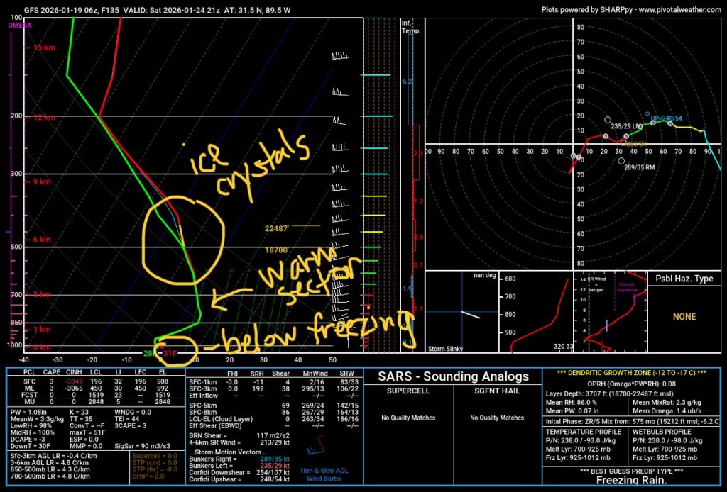 There are a couple of hang-ups with how far south this system will go. While the Skew-Ts look good for their dendritic growth zone (ice crystal formation in the atmosphere), warm sector and ground temperature, this isn’t a guarantee for everyone. Some areas may stay above the freezing mark at the ground and prevent ice from accumulating. I do think that many areas will still see the possibility of freezing rain, though. Another big concern will be how much ice accumulates. If we’re over 1/4 of an inch, then we have some problems.
