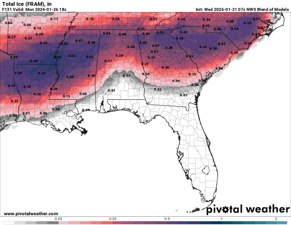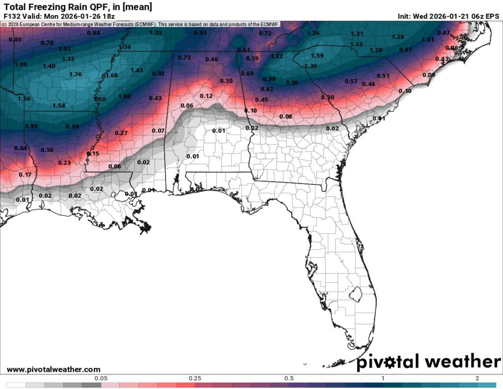 Looking at the ensemble above, there is a fine line between the freezing mark for many of us. This will be a big factor as to whether ice will be able to accumulate as the ground temperature needs to be at the freezing mark. Some areas may just see rain while 10 miles away may see some ice accumulation. Models are more in agreement, but we’ll also have to look at the conditions when the storm system moves in. Another big thing to consider is how much accumulation is happening around the area. Many areas that reach over the quarter inch mark will have something to worry about especially with roads and power lines, so keep that in mind. All this to say that we’re getting closer to an answer but we’re still going to have to wait a bit to know what will likely happen. Until then, stay tuned.