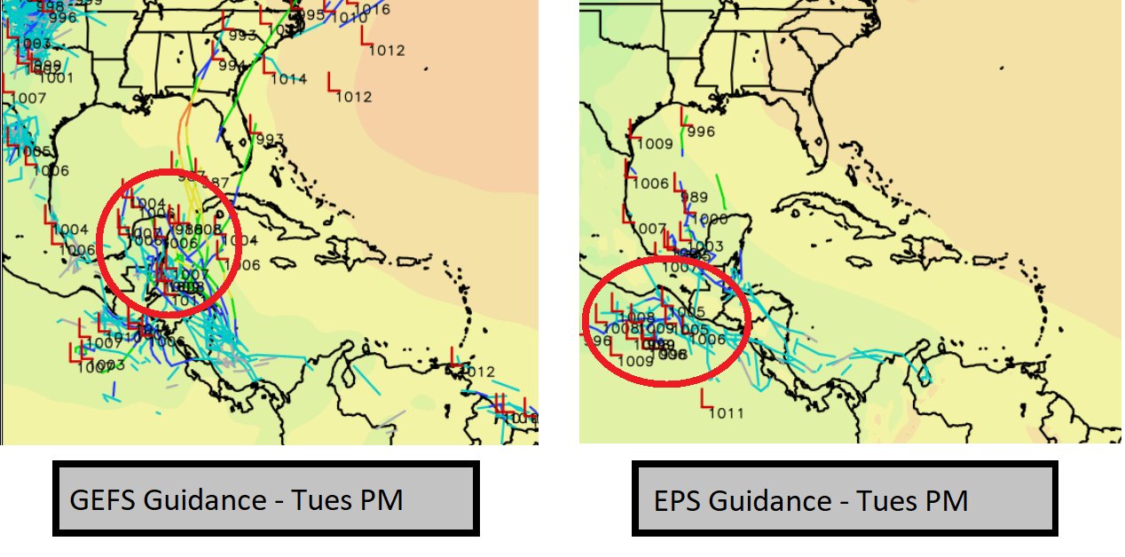 The American model, the GEFS, shows more of the development happening on the east side of Central America and the area of low pressure drifting north into the Gulf. While the European model, the EPS, shows more evidence that the area of low pressure forms on the west side of Central America.
