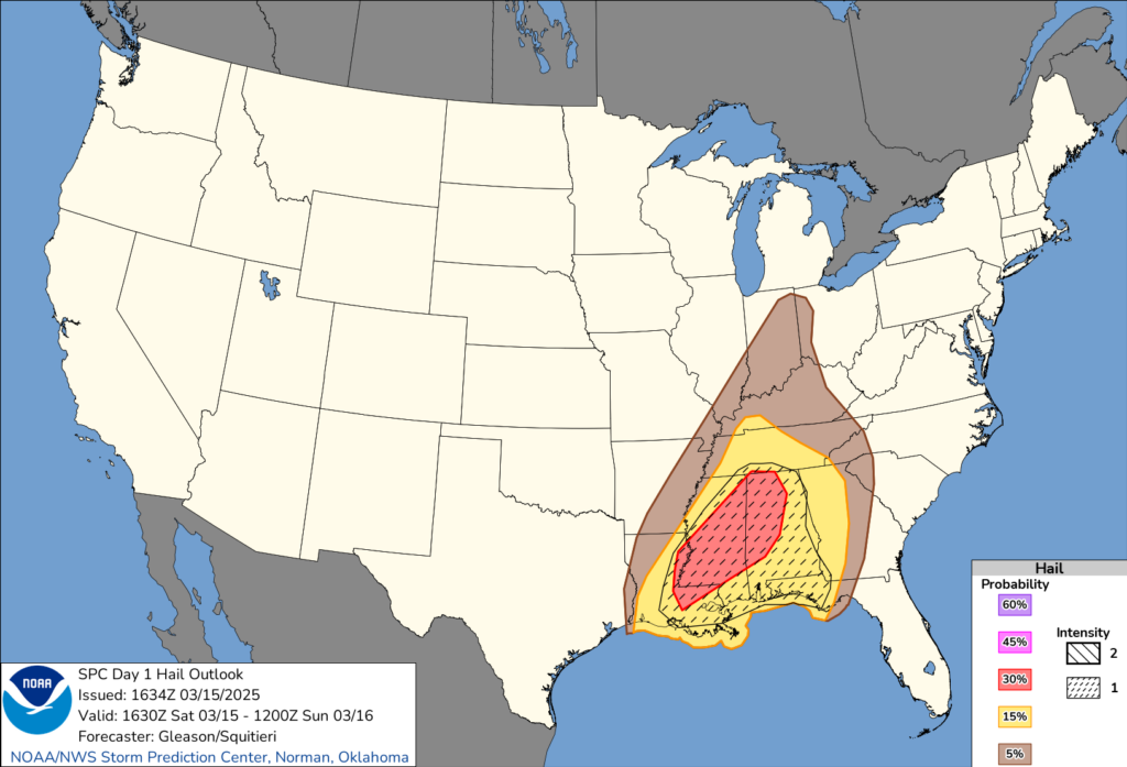 For hail, the new outlooks use intensity tic marks 1 and 2 to show increasing conditional intensity if hail occurs. In general, no intensity tic mark points to mostly hail under 2 inches, intensity tic mark 1 points to hail over 2 inches, and intensity tic mark 2 points to hail over 3.5 inches. You don’t wanna be under that one!