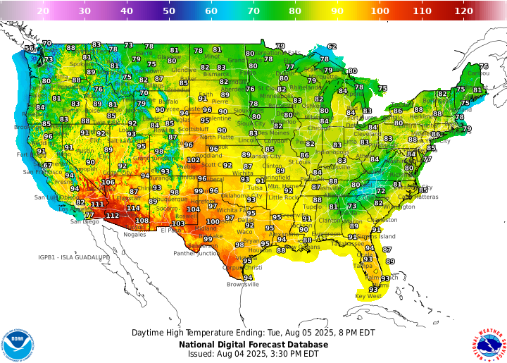Daytime high temperatures are still generally cooler than average over the midwest and interior northeast. The coastal southeast is still scorching, with not much relief in sight. The desert southwest is pushing 115 degrees, and the interior northwest is looking quite comfortable with 70s and 80s, plus no humidity.