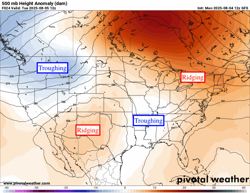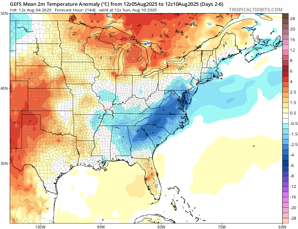 The area of low pressure will increase cloudiness and rainfall, which will keep the temperatures down by 5-8 degrees on average this week ahead for most of the coastal east coast. It will still be hot, but there will be some relief from the heat this week in that region. Those in the upper midwest will see temperatures warmer than average this week, as a result of the passing ridge in southern Canada.