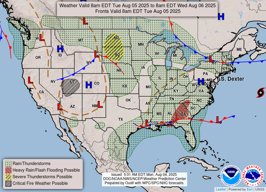 The overall mid-level pattern is producing ridging in the northeast and southwest, and troughing in the northwest and southeast. Under the areas of troughing, or generally near them, are frontal boundaries and areas of low pressure that are bringing the chance of flooding rain or severe weather. We are no longer getting much rain in the south coastal Atlantic states from Tropical Storm Dexter, but we are from another tropical disturbance, in the same region where Dexter formed. Keep an eye out for flash flooding in Georgia, southeastern Alabama, and western North/South Carolina as a result of this low pressure and associated stalled out front.