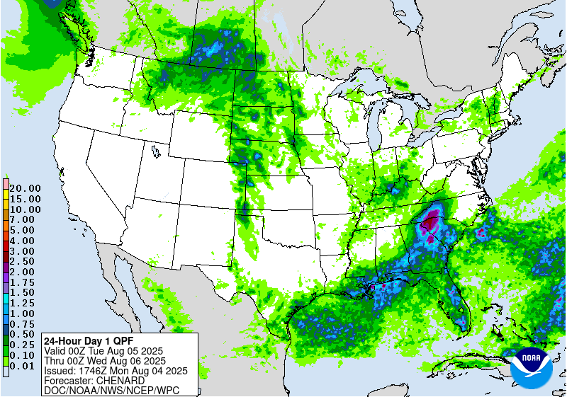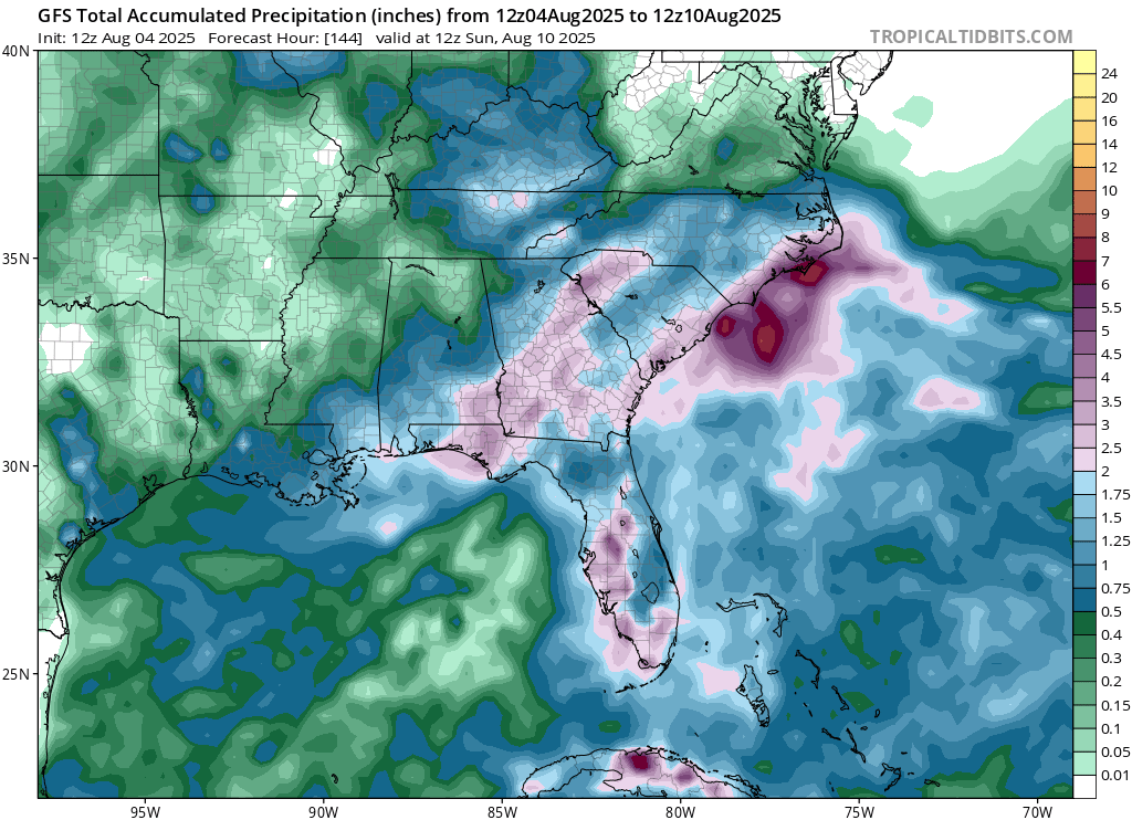 Rainfall will be above normal for the Atlantic coastal southeast states, due to an area of low pressure that will stick around for a few days. This low pressure is currently an “area to watch” by the National Hurricane Center and has a 30 percent chance of forming a tropical depression in the next 7 days. This will dump locally 5-8 inches plus in some areas, so this is defiently something that could be a flooding concern. Marginal (at least 5 percent) risk zones of flash flooding are in place for most of the days this week for coastal NC/SC/GA, but upgrades to this are certainly likely since this will be a slow moving system.