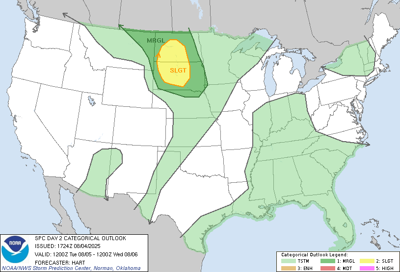 Today we are expecting some severe weather to impact the northern Plains. A Slight (level 2/5) risk of severe weather is highlighted in yellow over the Dakotas, with a Marginal (level 1/5) risk stretching into northern Nebraska and eastern Montana. Areas in light green are expecting some possible thunderstorms today, but nothing severe is expected in those areas.