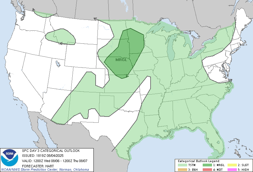 Tomorrow, the severe weather threat moves a little further east and southeastward. A Marginal (1/5) risk is outlined for the threat of the same storms from today producing strong gusty winds and hail in the morning on Wednesday. The system will generally start weakening on Wednesday, but before it does it will impact the region. We will be keeping our eyes out for any upgrades as we get closer.