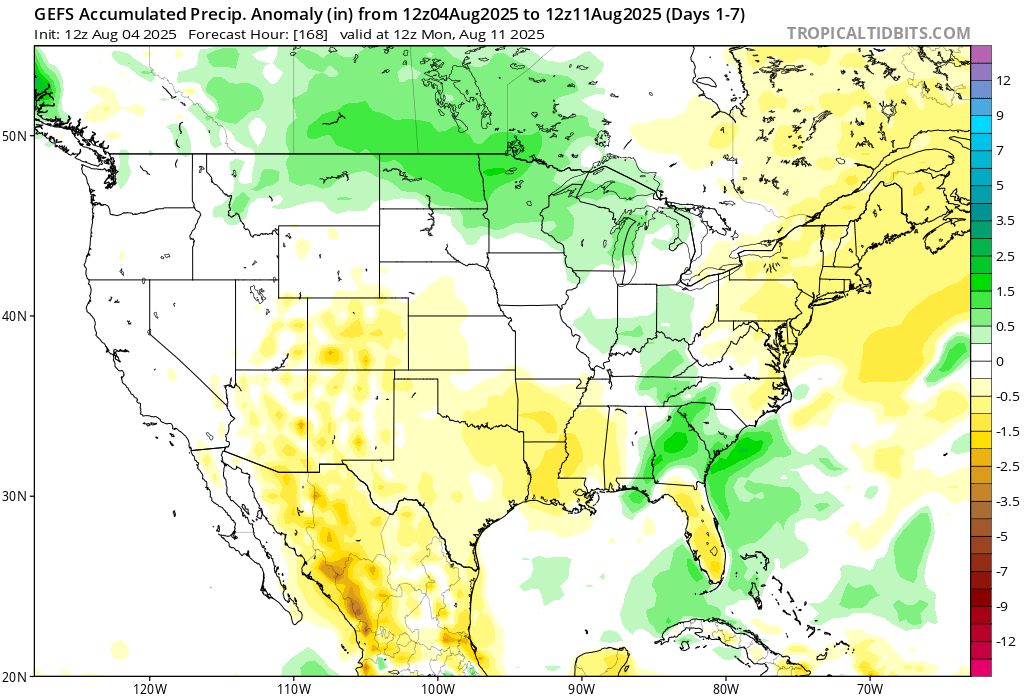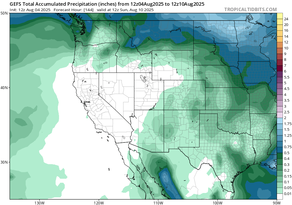 Here’s a look at the GEFS modeled precipitation anomalies through Monday 12z. Green indicates above average precipitation, white indicates average precipitation, and yellow indicates below average precipitation. Let’s look into the details by region: