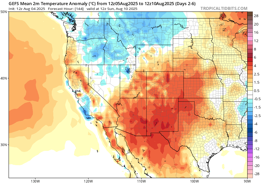 In the Pacific Northwest and northern Rockies region, you could expect cooler than normal temperatures for the week, due to a nice trough digging down into the region by late week, bringing with it some rain (mostly for Montana).