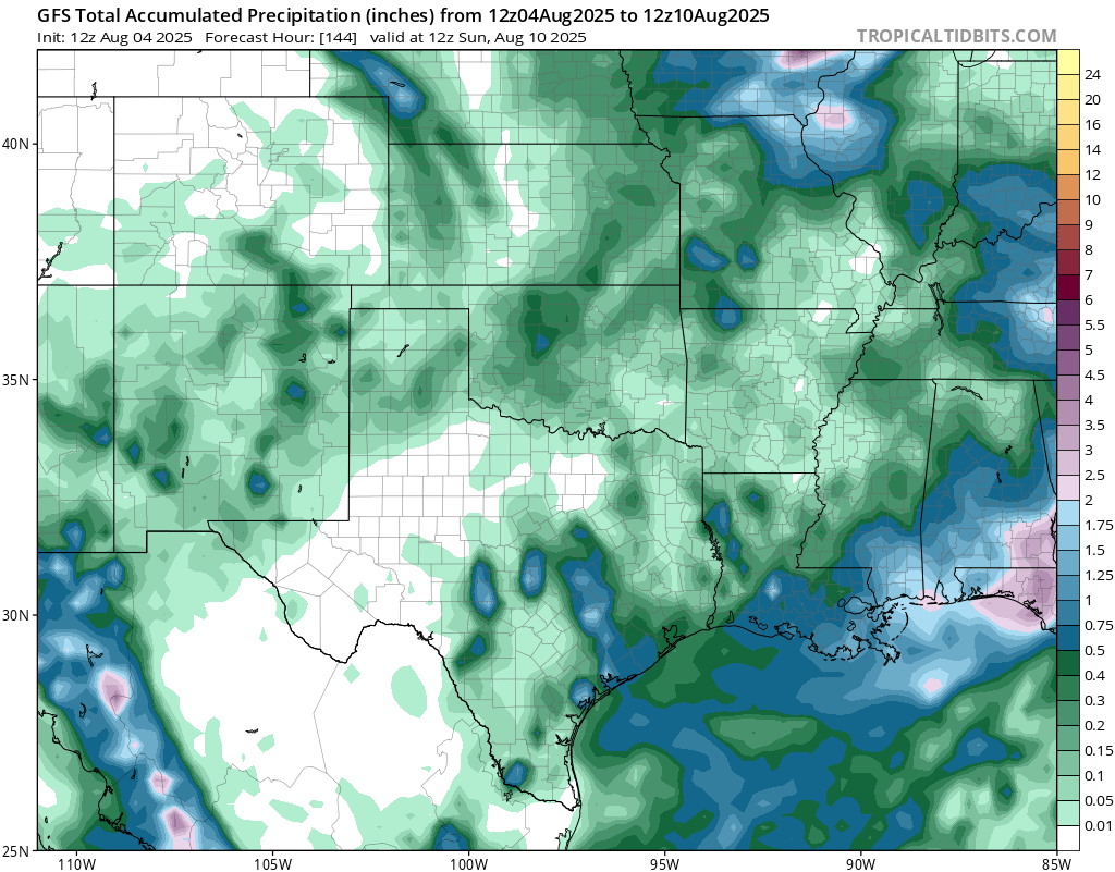Scattered rain is expected for this week, but mostly dry conditons are expected in the southern plains and through Texas. Sunday is looking to be the day with the most rain for this region, as a low pressure system is expected to pass through from the west.