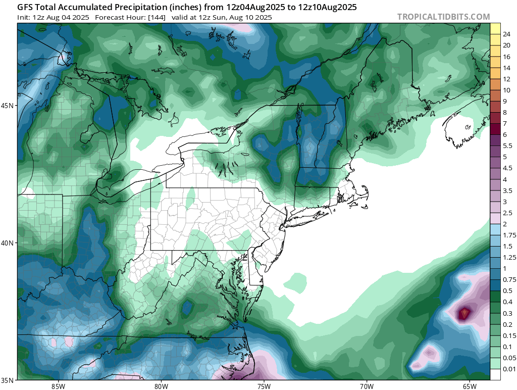 The northeast is looking mainly dry this week, thanks to some high pressure dominating the area. Some areas in the interior northeast could see an inch or 2, but no washouts are expected for the week or weekend for the majority.