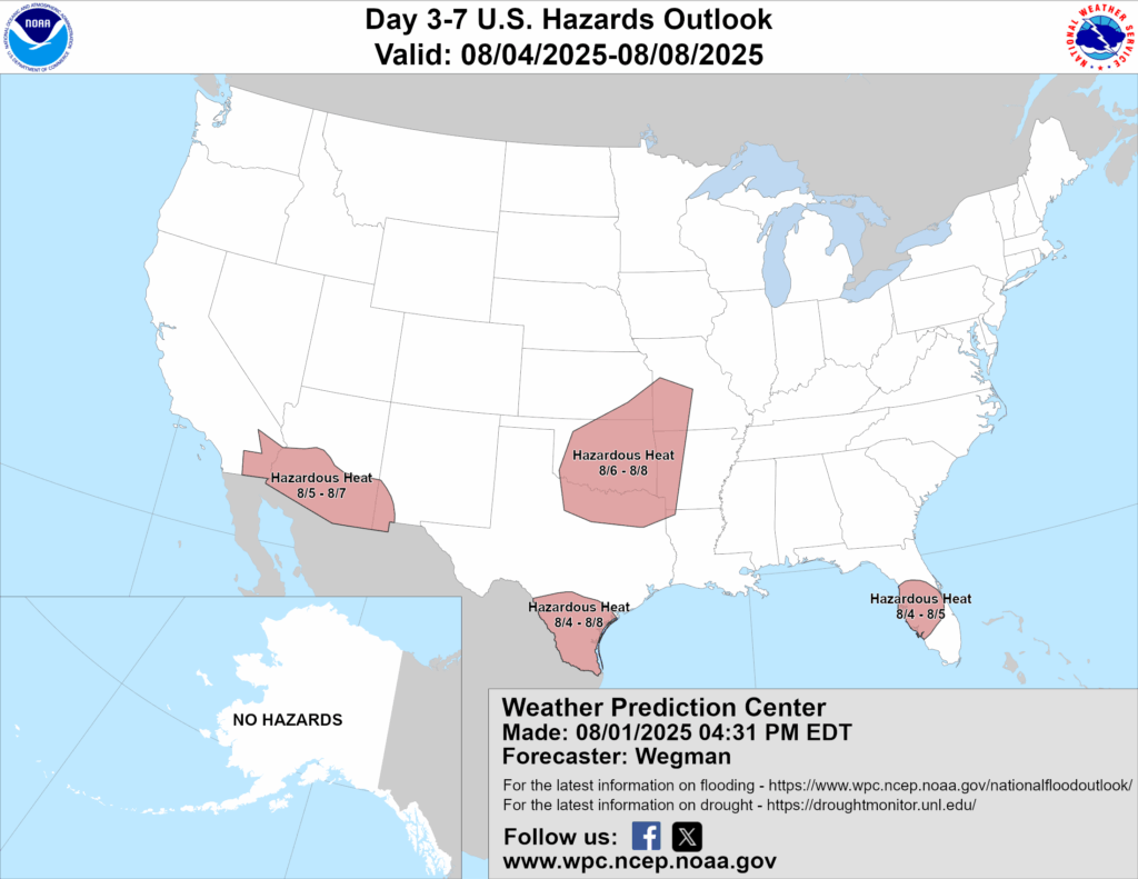 Above is a look at the U.S Hazards Outlook from NOAA, highlighting areas of extreme weather to be aware of for the next 3-7 days. Hazardous heat is the main concerns for the red highlighted areas above.