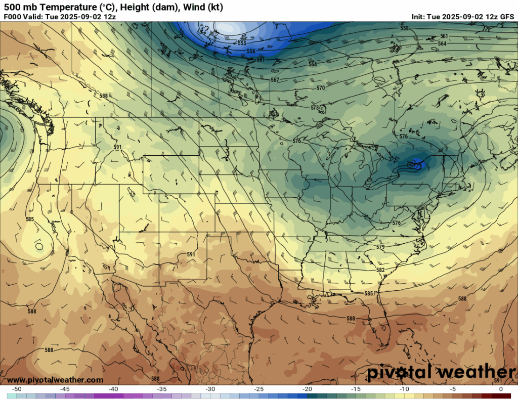 Current 500 mb Temperatures, Heights, and Winds // Courtesy: Pivotal Weather