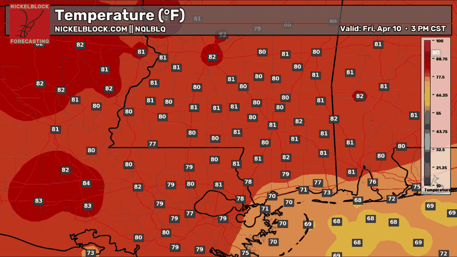 Expect a mix of sun and clouds for your Friday with temps near 80, closer to 70 for the MS coast. Our easterly flow will continue, so we won’t see a crazy moist Gulf airmass, but definitely not a dry northerly one either. Think somewhere in the middle, with low to moderate humidity for the day. As I mentioned earlier, if you see an isolated pop-up shower, do not be surprised, but it’s more likely than not that you won’t see any sort of rain, and you’ll have a dry Friday.