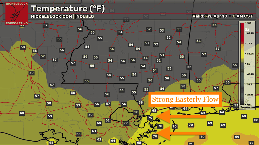 We’ll see a low in the low-to-mid 50s on the mainland and closer to 60 or 70 along the immediate coast, thanks to a strong easterly flow bringing in a milder airmass off of the northern Gulf. This easterly flow could also bring some higher-than-normal tides and lead to some minor coastal flooding. This threat is through around 10 PM tonight.