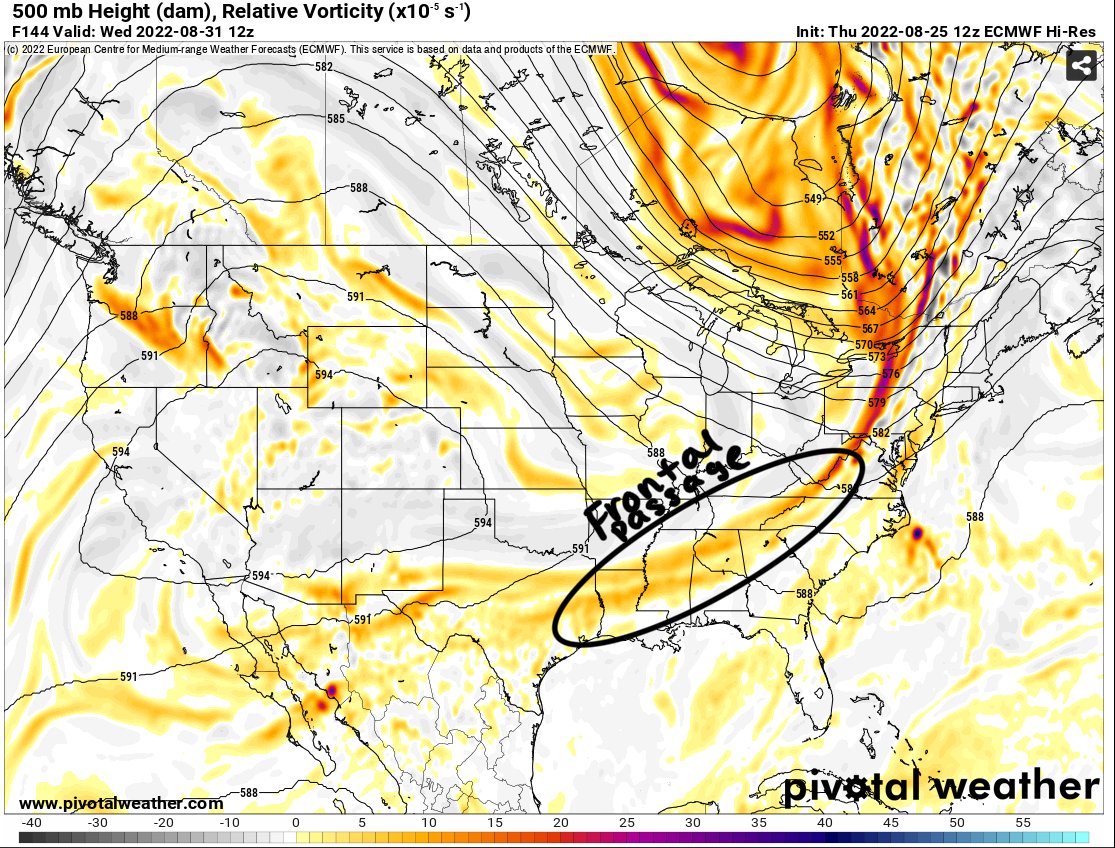 Starting with the European solution, this shows our region experiencing a frontal passage, which would lead to lowered humidity values and lowering the chances for day-time showers and thunderstorms.